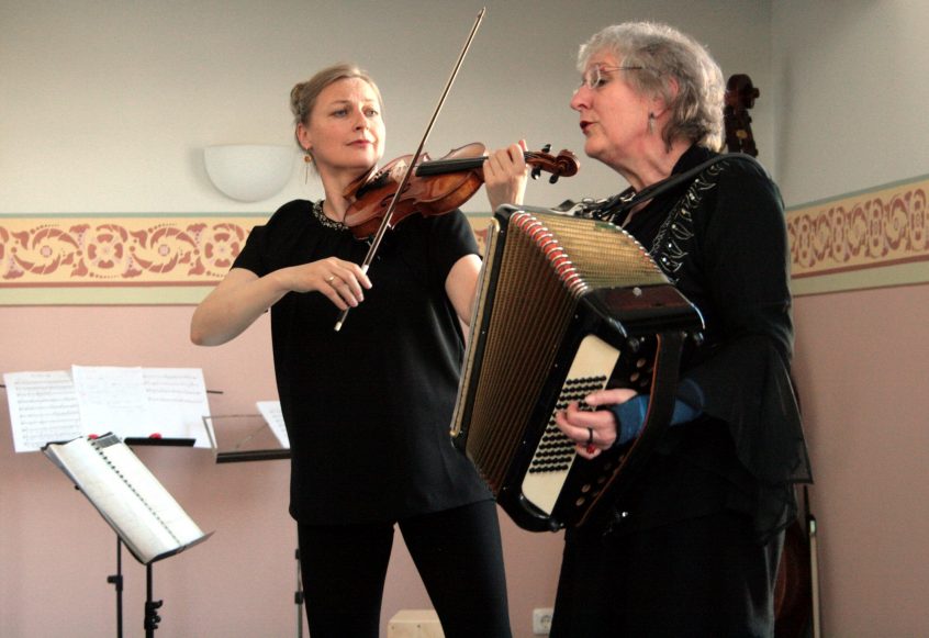 Brachten volksmusikalische Feststimmung in die Räume der ehemaligen Synagoge in Niederzissen: Roswitha Dasch und Katharina Müther. Zum Teil zusammen mit dem Festival-Chor bestritten die beiden Dozentinnen das musikalische Programm der ersten Hälfte des bemerkenswerten Musikfestes in Niederzissen. Foto: ab