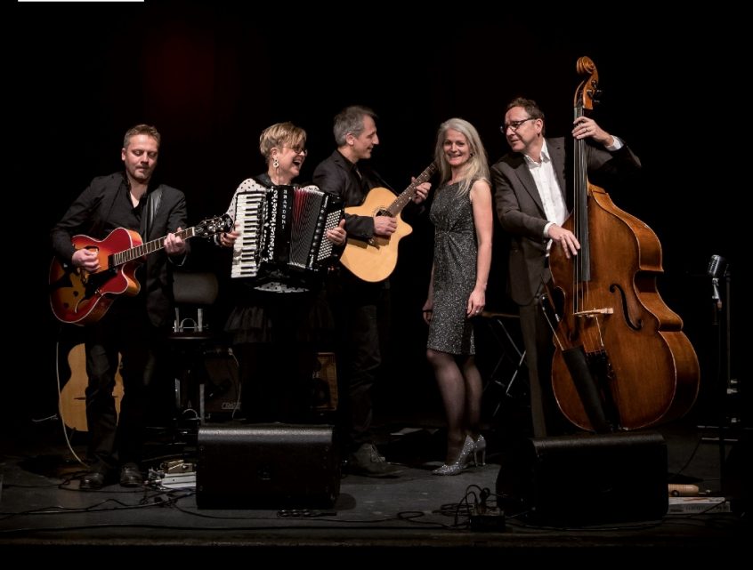 Nid de Poule“, das sind Bille Klingspor, Gesang, Frank Zinkant, Gitarre, Gerd Rentschler, Gitarre, Jürgen Dorn, Kontrabass, und Almut Schwab von Klezmers Techter, Akkordeon. Pumpende Viertelakkorde, die aus dem Schallloch der Gypsygitarre drängen, vorwärts-treibende Kontrabasslinien, virtuose Soli, eine Gesangsstimme, die schwerelos über allem zu schweben scheint – das ist