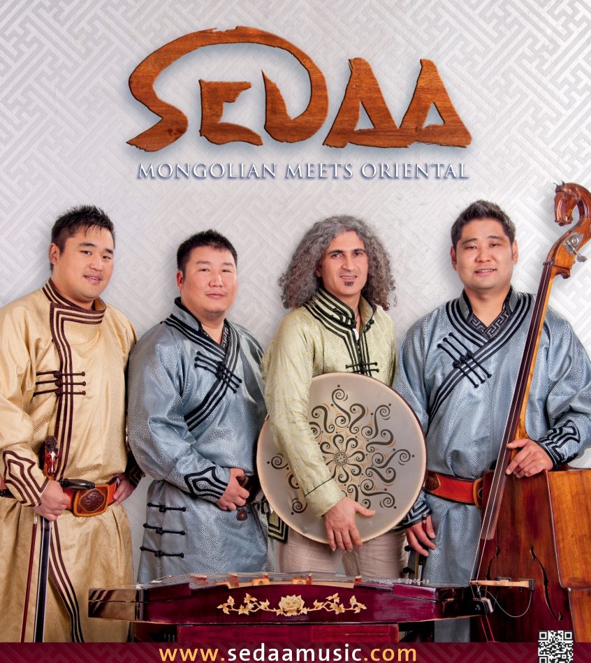 Seit ihrer Gründung 2009 verbindet die mongolisch persische Formation SEDAA auf außergewöhnliche Weise die archaischen Klänge der traditionellen mongolischen Musik mit orientalischen Harmonien und Rhythmen zu einem faszinierenden Ganzen. Die in ihrer mongolischen Heimat ausgebildeten Meistersänger Nasaa Nasanjargal (mitwirkend beim Filmmusik zu „der weinende Kamel“), Naraa Naranbaatar und der virtuose Hackbrettspieler Ganzorig Davaakhuu entführen gemeinsam mit dem iranischen Multiinstrumentalisten Omid Bahadori in eine wahrhaft exotische Welt zwischen Orient und mongolischer Steppe. Die Grundlage ihrer modernen Kompositionen bilden Naturklänge – erzeugt mit traditionellen Instrumenten und durch die Anwendung uralter Gesangstechniken nomadischer Vorfahren, bei denen ein Mensch mehrere Töne zugleich hervorbringt. Vibrierende Untertongesänge und der Kehlgesang Hömii sowie die wehmütigen Klänge der Pferdekopfgeige Morin Khuur verschmelzen zusammen mit pulsierenden Trommelrhythmen zu einem mystischen Klangteppich der Schwingungen und Stimmungen, der den Zuhörer mitnimmt auf eine akustische Reise entlang der Seidenstrasse. www.sedaamusic.com