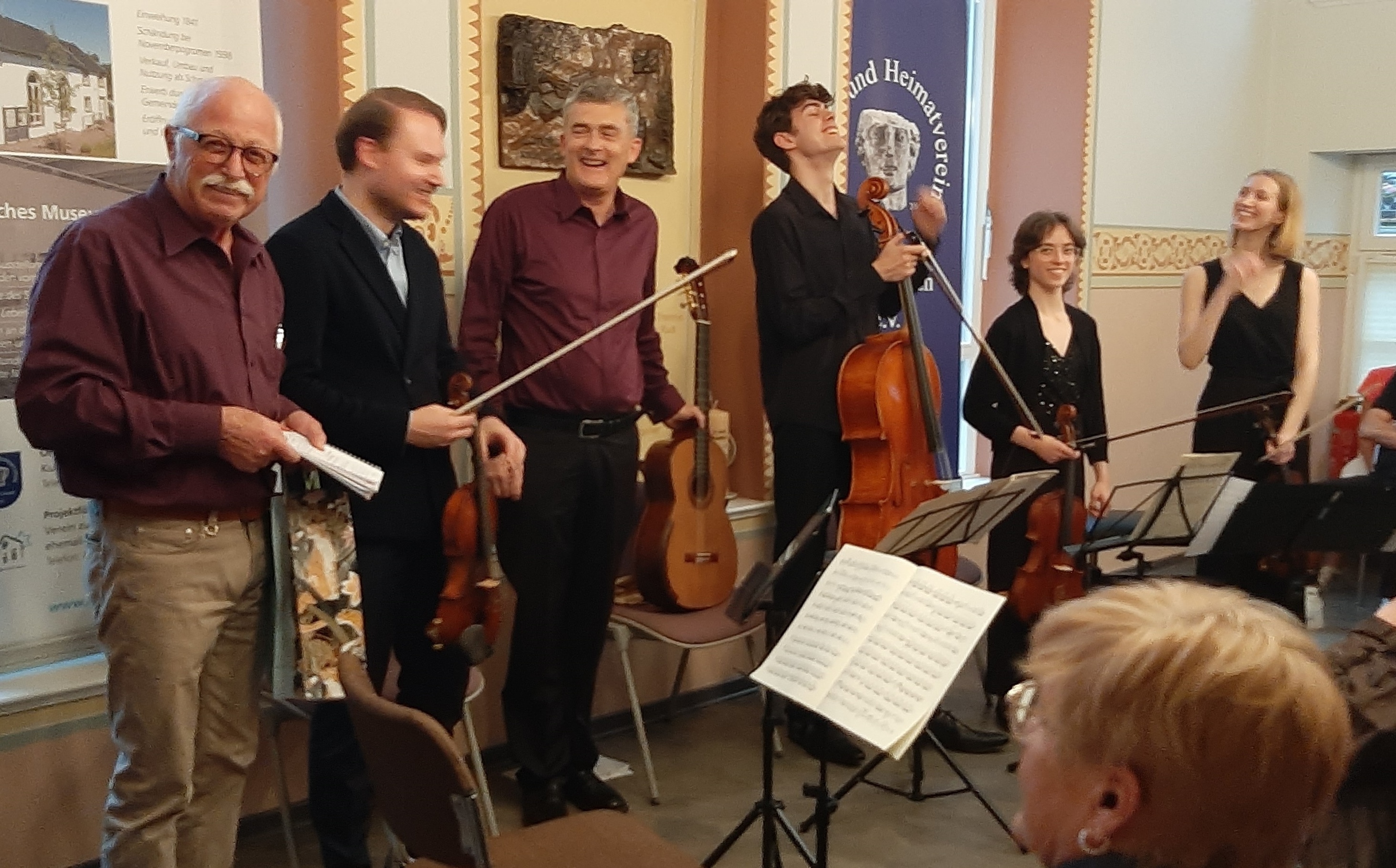 Zum Auftakt des Sommers erklang sommerliche Serenadenmusik in der ehemaligen Synagoge Niederzissen. Vor ausverkauftem Haus spielten sich der Meister-Gitarrist Claudio Piastra aus Parma mit vier jungen Streichern der Villa Musica, Niklas Liepe, Violine, Giulia Rimonda, Violine, Céline Eberhard, Bratsche, und Syon Najman, Violoncello, in die Herzen der begeisterten Besucher. Mit dem Trio für Violine des „Teufelsgeigers“ Niccolò Paganini (1782-1840) sorgten Niklas Liepe, Syon Najman, und Claudio Piastra für den italienisch virtuosen Auftakt. Bei dem