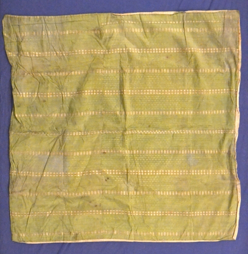 Die Decke aus hellgrünen Seidenstoff mit eingewebten Blockstreifen ist sehr gut erhalten. Sie ist aus sieben einzelnen Teilen zusammengesetzt, was vermuten lässt, dass es sich bei dem Stoff um einen Kleiderstoff handelt, der in Zweitnutzung für die Decke verwendet wurde. Das Futter besteht aus einfachem, ungebleichtem und handgewebtem Leinen. In nicht so wohlhabenden jüdischen Gemeinden auf dem Land war es üblich, aus guten Stoffresten Textilien für die Synagoge anzufertigen.